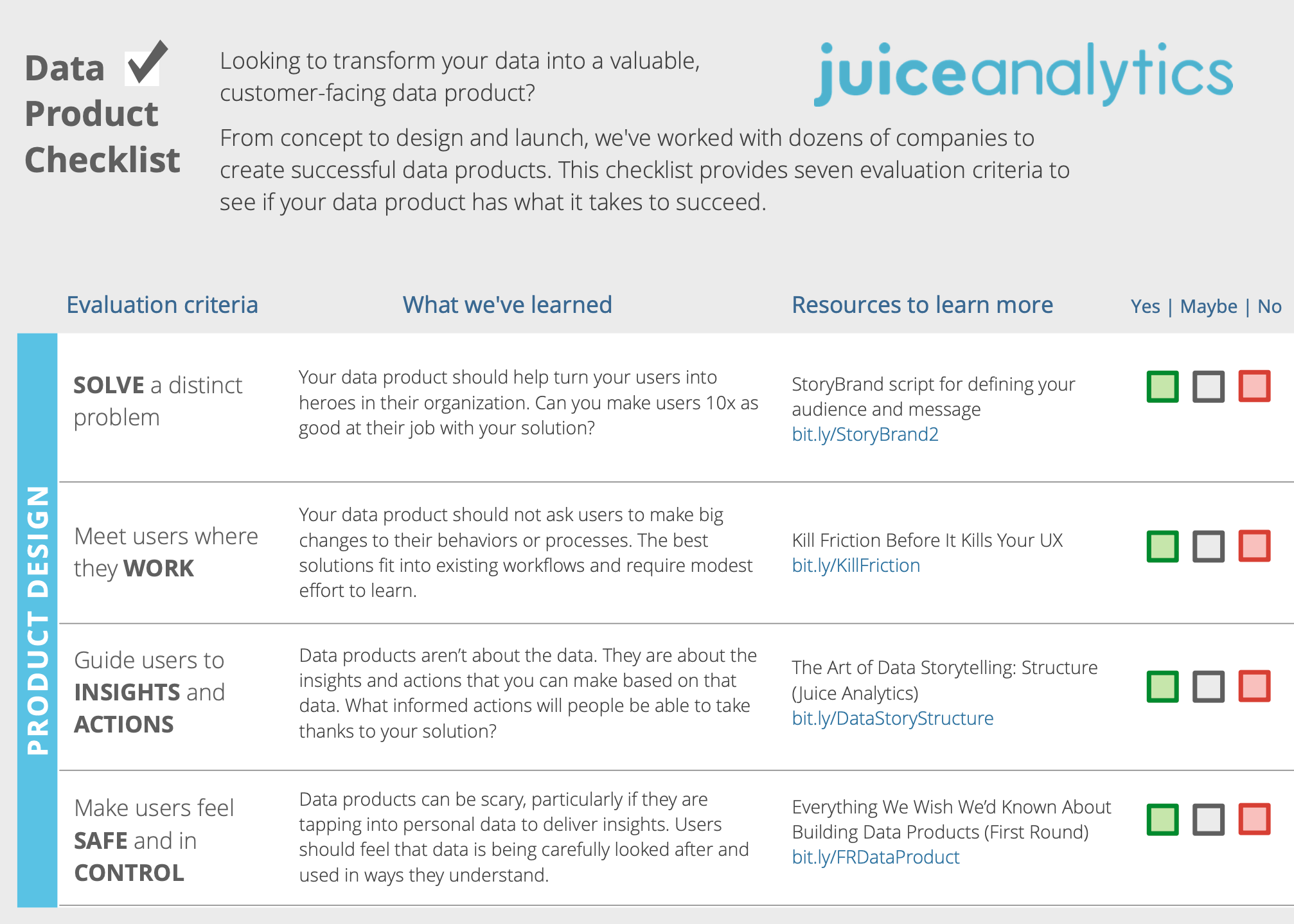 At Juice Analytics, we’ve partnered with dozens of organizations over the years to create intuitive, actionable data products that people genuinely want to use. We’ve learned that the path from idea to successful launch is riddled with friction points—from unclear audiences to clunky user experiences to missing business models.
