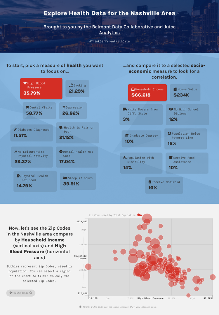 I recently attended a workshop put on by the Belmont Data Collaborative, part of a wider Belmont event focused on “Data-Informed Social Innovation so Regions can Thrive”. The goal was to use data to drive the discussion on health disparities in our local Nashville community. In particular, the analysis focused on hypertension as a prominent health condition in economically-disadvantaged communities.